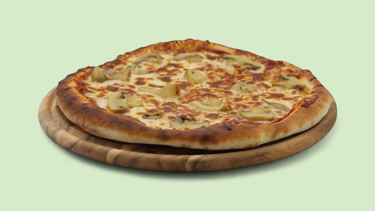 Mit italienischer Pizza Sauce, Käse und Champignon. Wird mit täglich frischem veganem Teig und Liebe zubereitet.