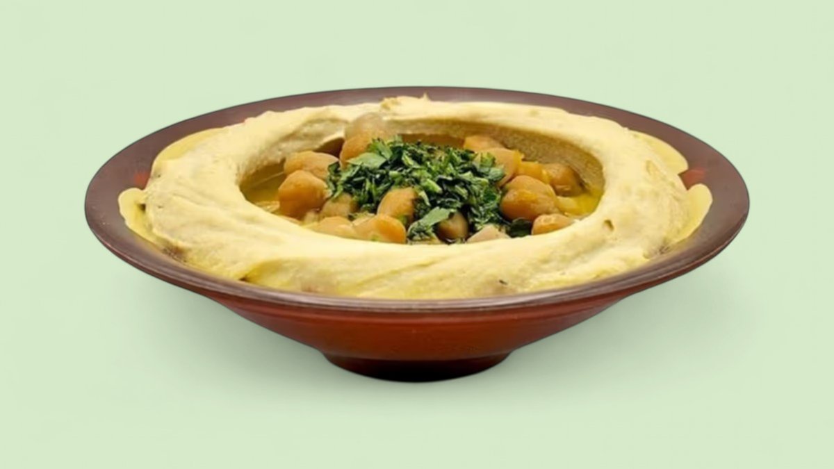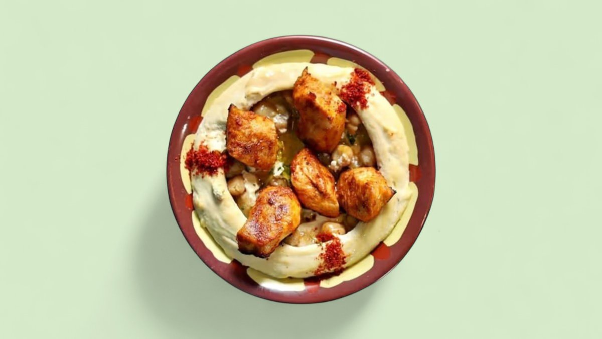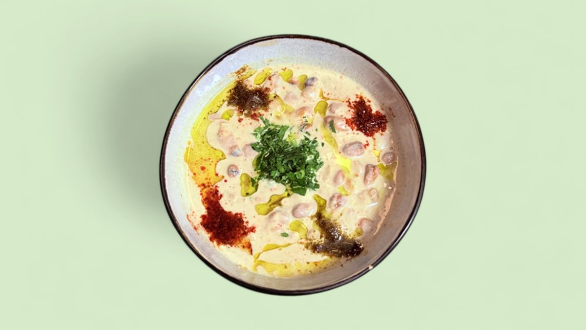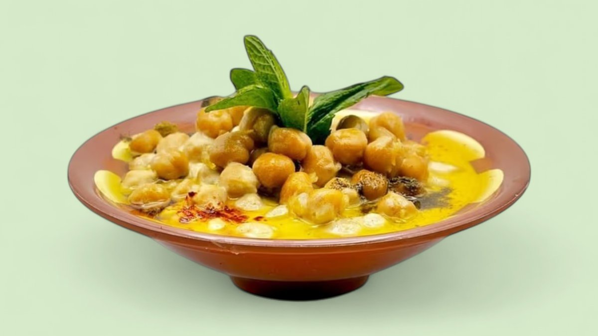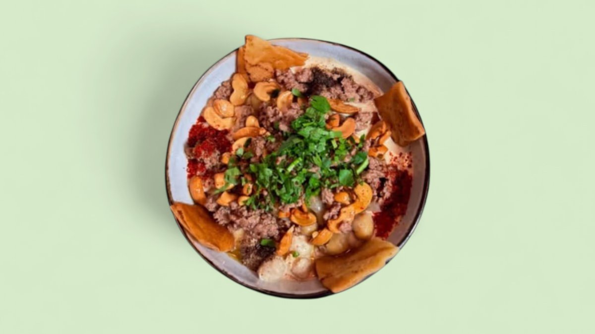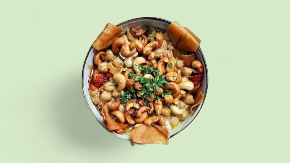 ein levantinisches Gericht, mit frisch geröstetem zerbrochenem Brot, einer veganem Tahini Sauce, Kichererbsen, Ghee und Nüssen
