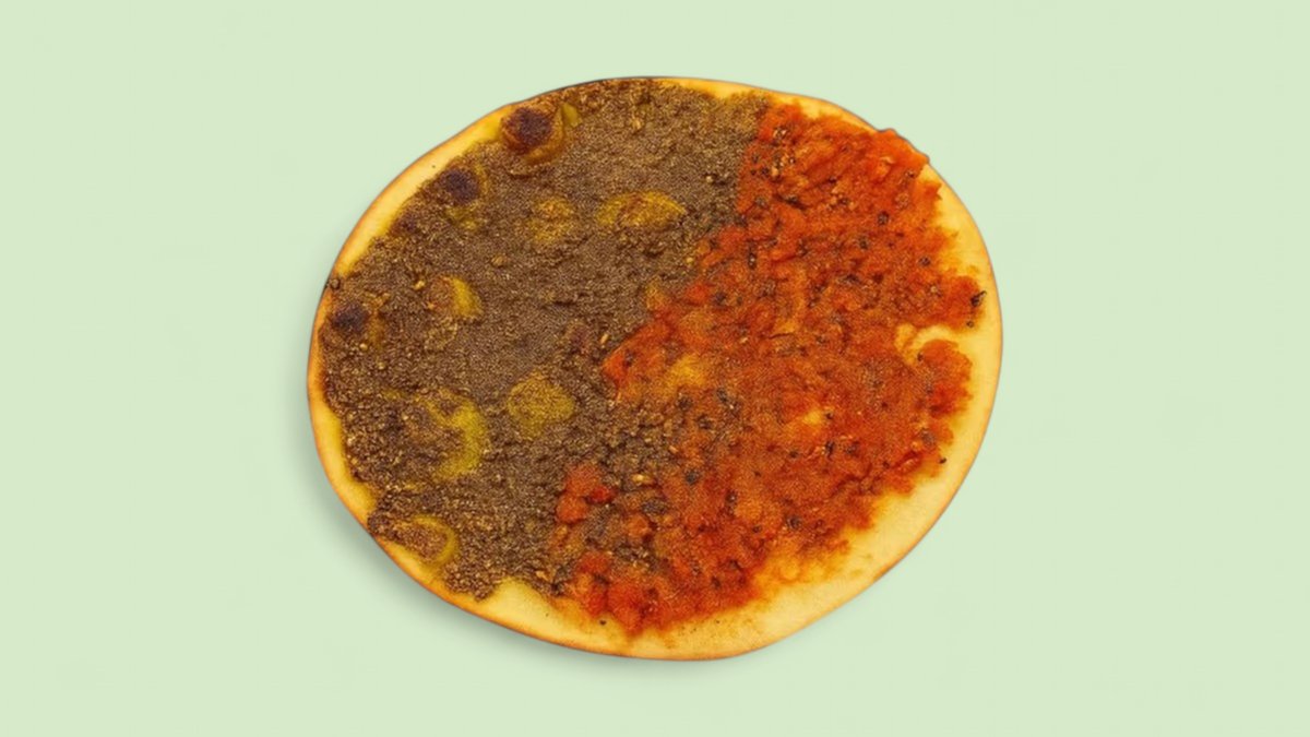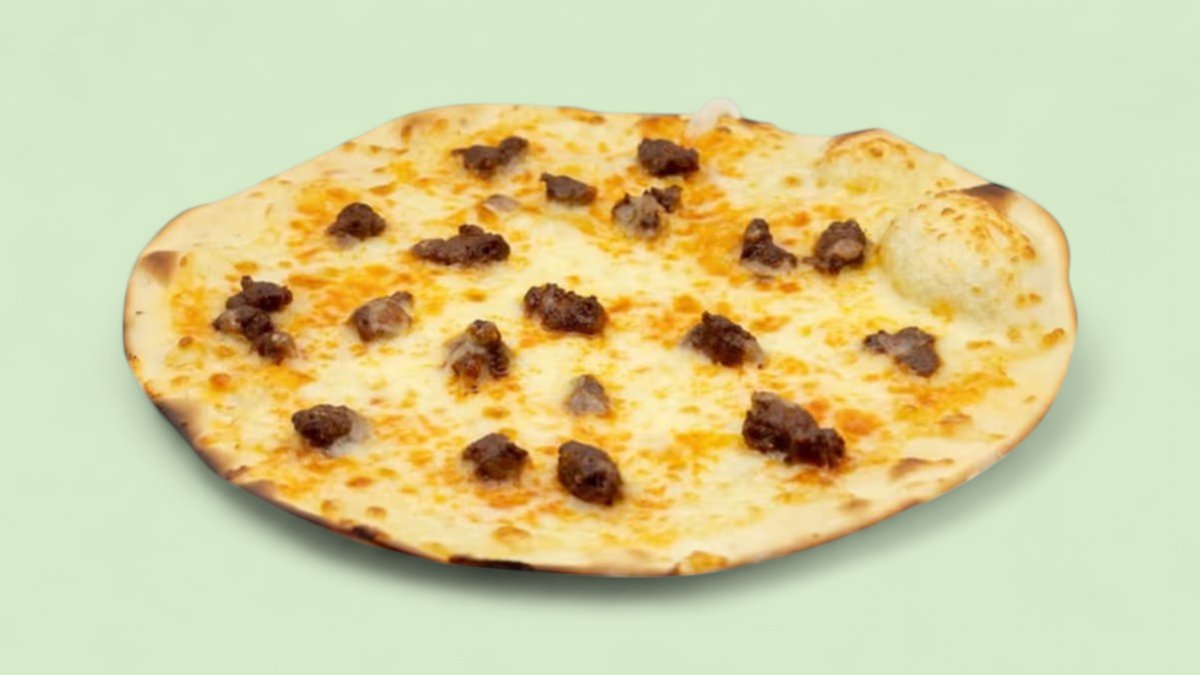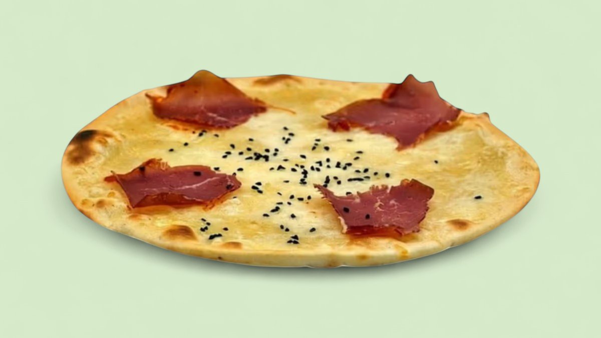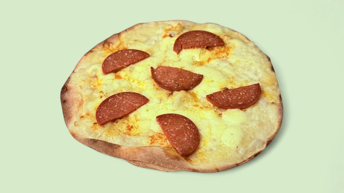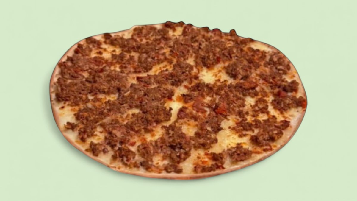 Mit italienischer Pizza Sauce, Käse und türkischer Sucuk. Wird mit täglich frischem veganem Teig und Liebe zubereitet.