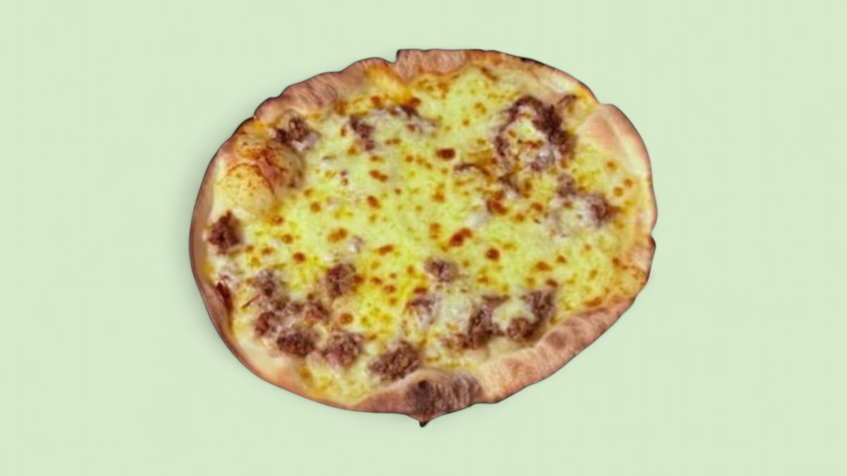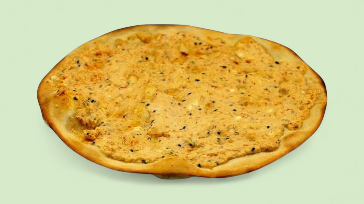 Mit italienischer Pizza Sauce, Käse, Zwiebeln und Tuna. Wird mit täglich frischem veganem Teig und Liebe zubereitet.