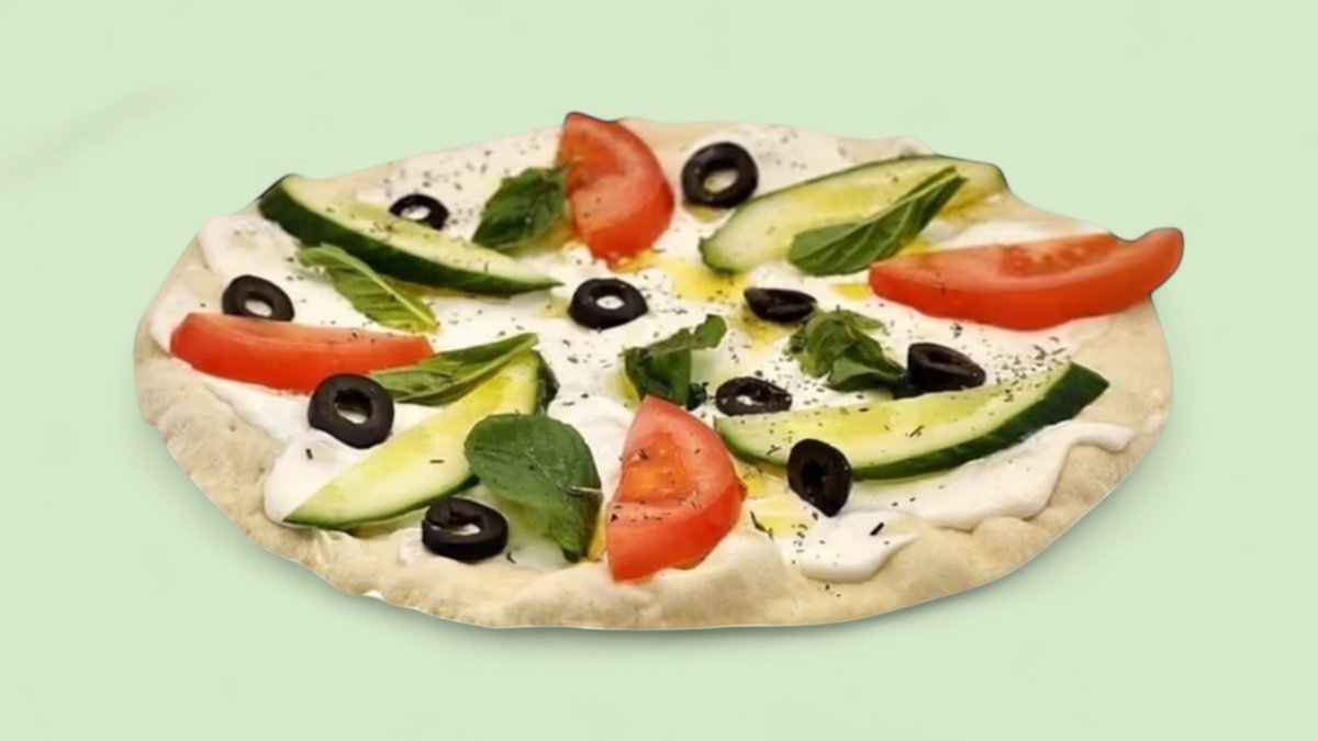 Mit italienischer Pizza Sauce, Käse, Paprika, Champignon und schwarze Oliven. Wird mit täglich frischem veganem Teig und Liebe zubereitet.
