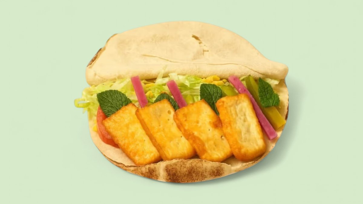 Halloumi, Eisbergsalat, Tomaten, Gewürzgurken und Tahini. Es wird mit Pommes Frites und ein Getränk serviert.