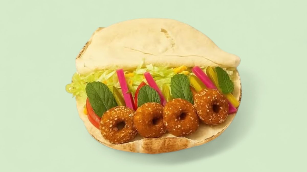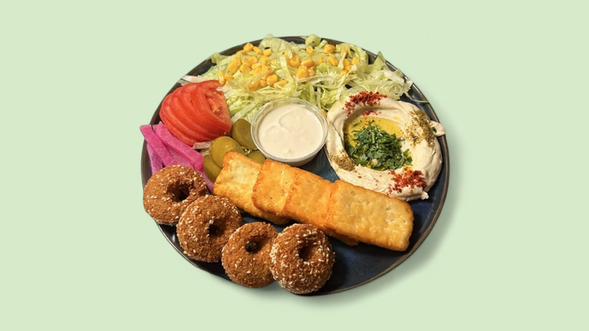 Falafel, Salat, Tomaten, eingelegte Gurken, eingelegte Rüben und Tahini. Es wird mit Pommes Frites und ein Getränk serviert.