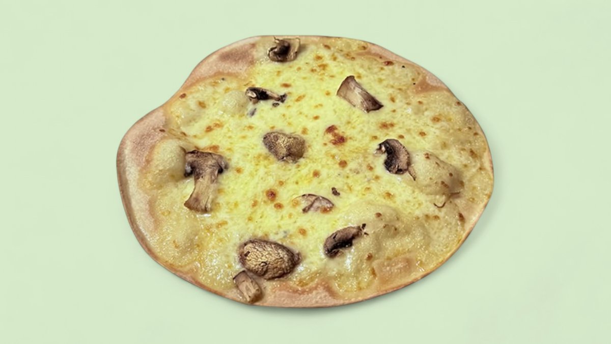 Mit italienischer Pizza Sauce, Käse und Champignon. Wird mit täglich frischem veganem Teig und Liebe zubereitet.
