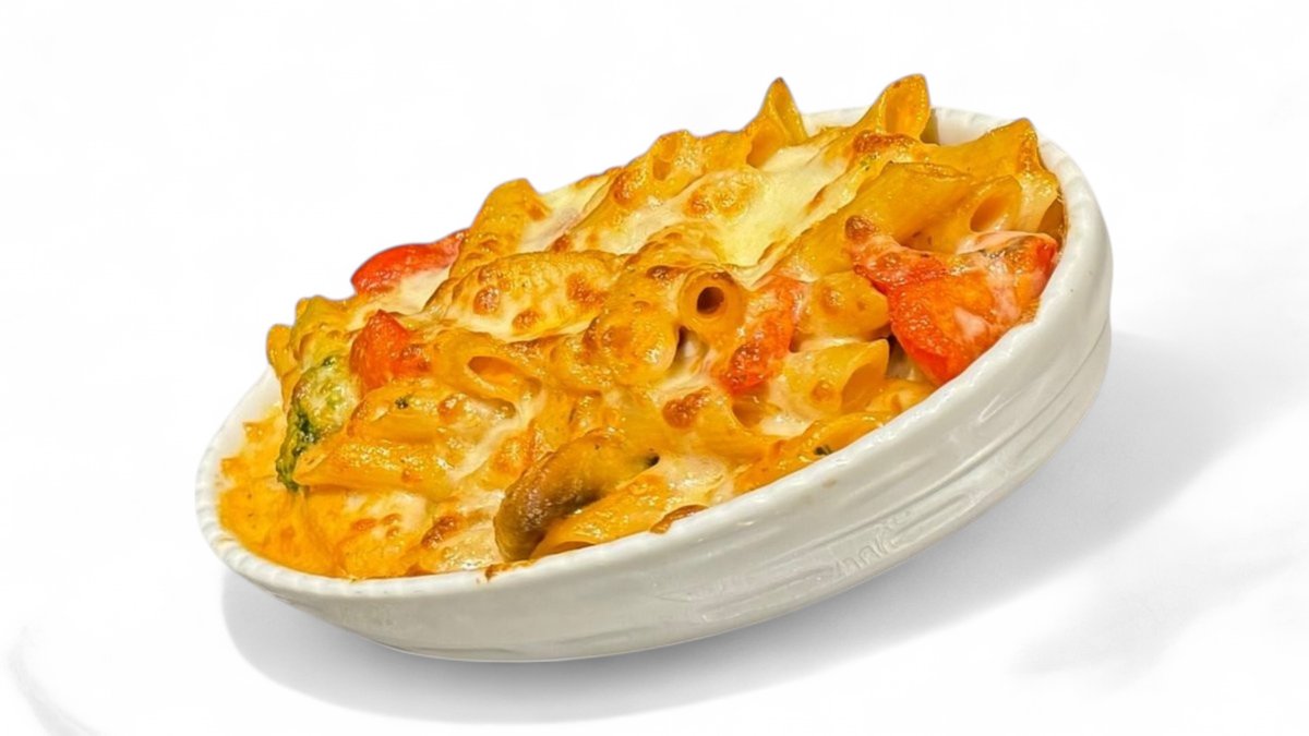 Mit Rigatoni , Brokkoli , Champignons und Paprika in Tomatensahne Soße und käseuberbacken