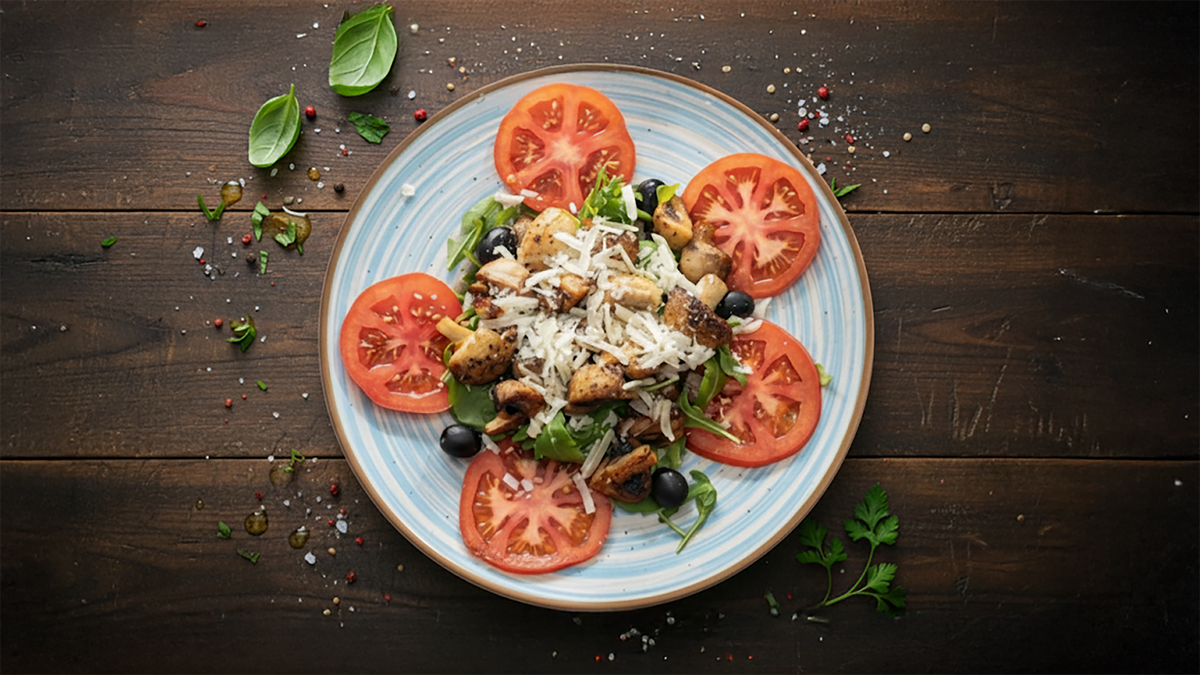 mit Hähnchenbrustfiletstreifen, frischen Champignons, Rucola und frischem Parmesan
