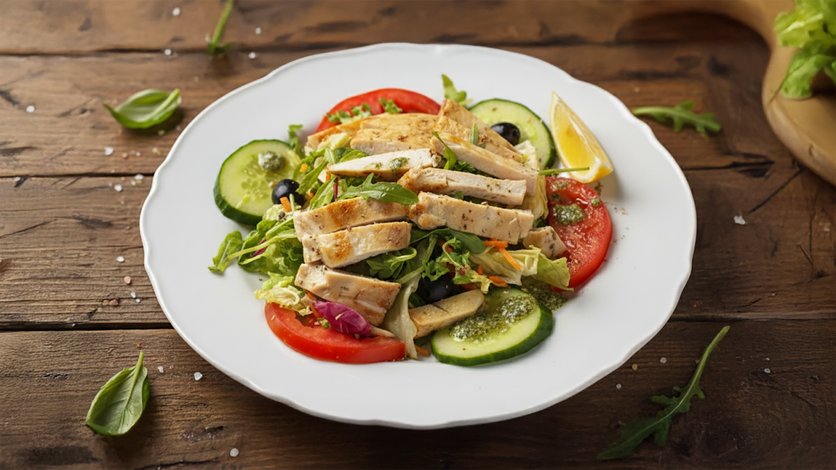 mit Rucola, Eisbergsalat, Tomaten, Oliven, Gurken und Zwiebeln