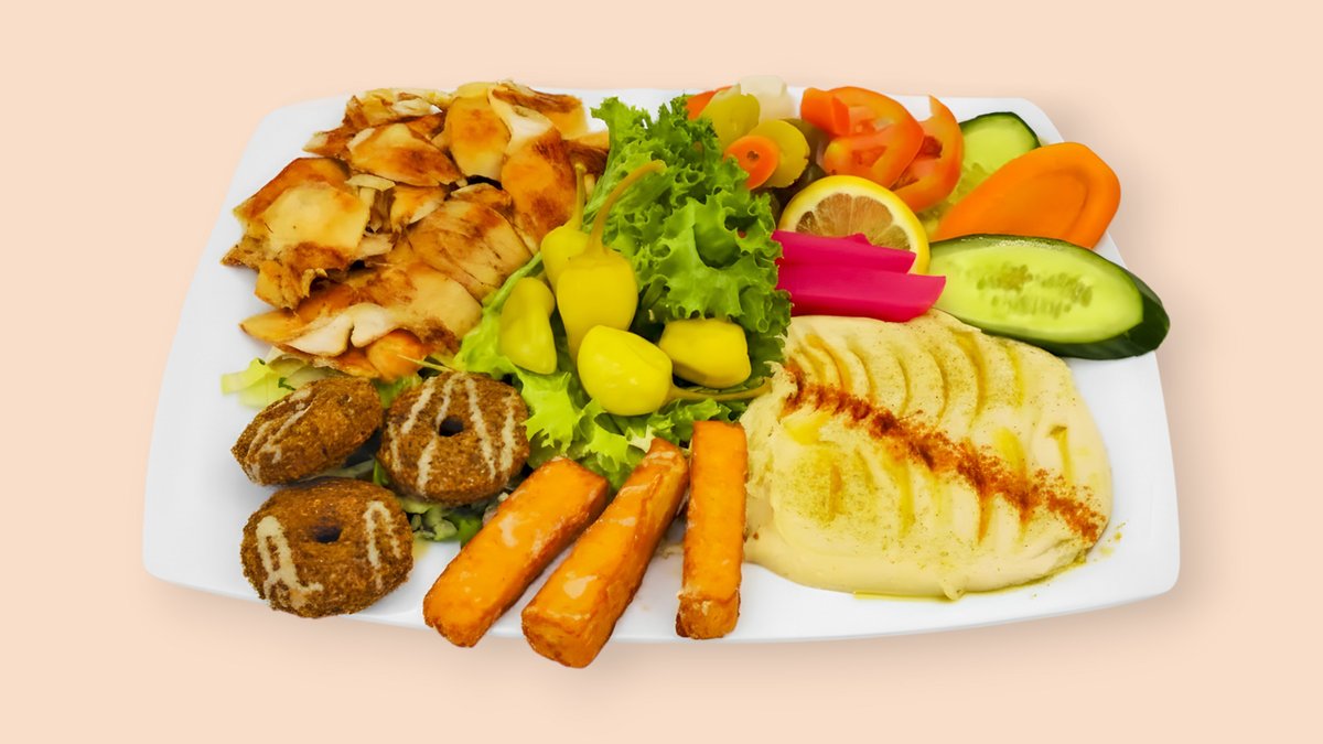 Schawarma, Gemüse, Falafel, Halloumi, Hummus und Salat