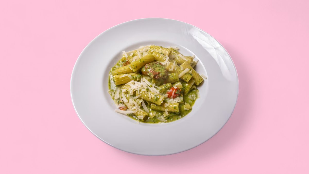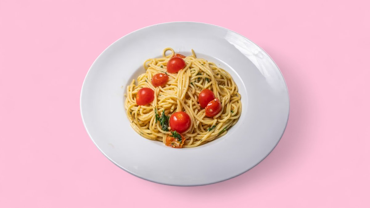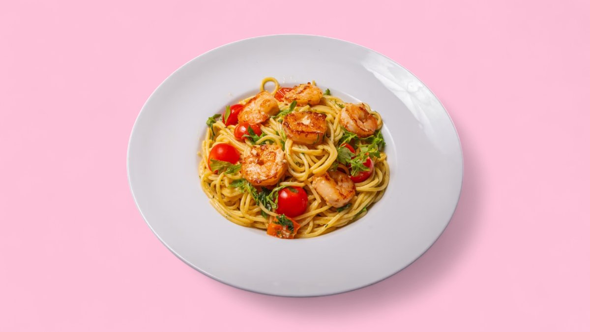 mit Olivenöl, Knoblauch, Kirschtomaten, Basilikum und 6 Garnelen