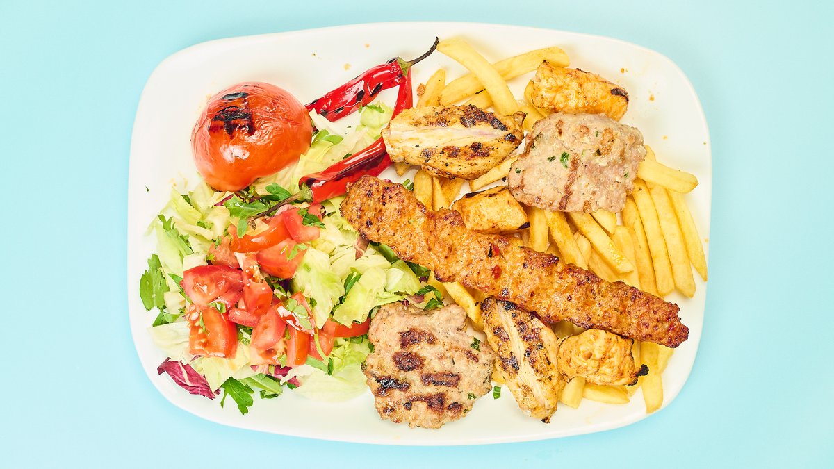 mit türkischen Boulleten aus Rind- und Lammhackfleisch, Hähnchenspieß und Kalbfleischspieß