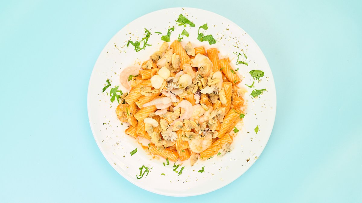 mit Meeresfrüchten, Sahnesoße, Tomatensoße und Rucola