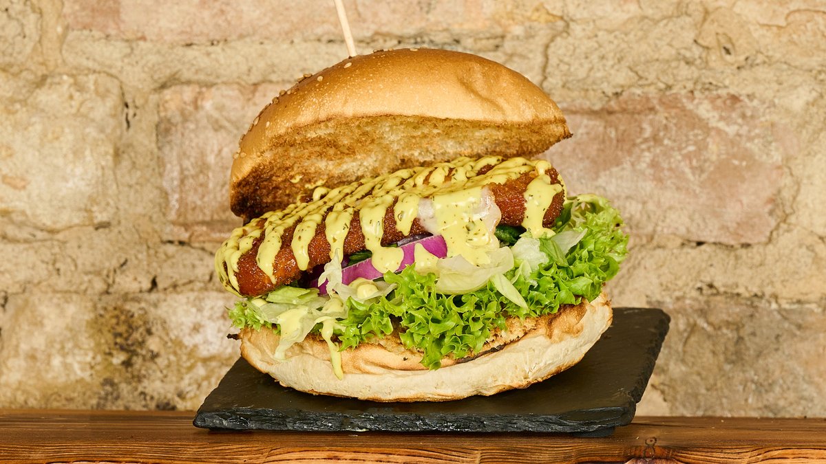 Cremiger Mozzarella-Patty aus italienischem Käse, goldbraun gebacken, Basilikum-Pesto, frischer Salatmix, rote Zwiebel, Tomate & hausgemachte Burgersauce. Mediterraner Genuss pur!