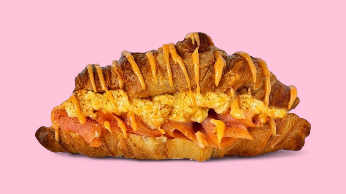 Ein frisches Croissant gefüllt mit Lachs, Frischkäse, Rührei und Chilli-Mayo