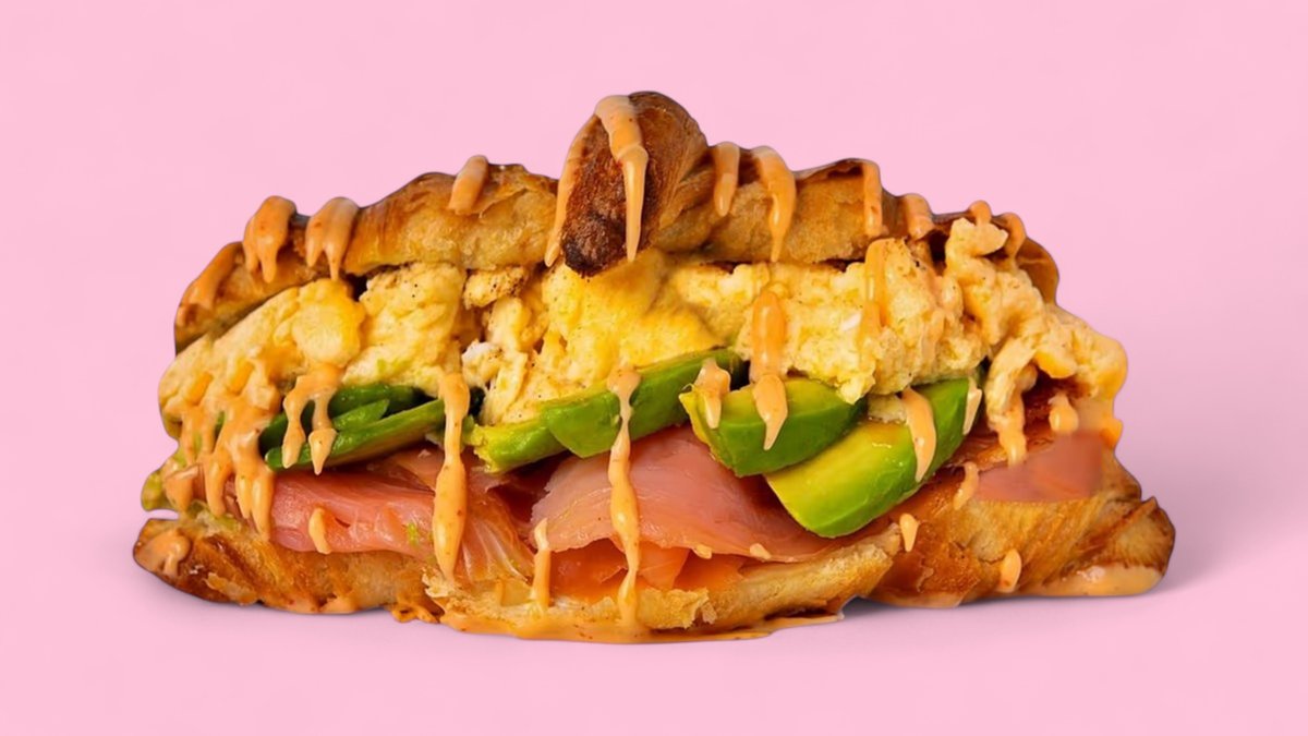 Ein frisches Croissant gefüllt mit Avocado, Lachs, Frischkäse, Rührei und Chilli-Mayo