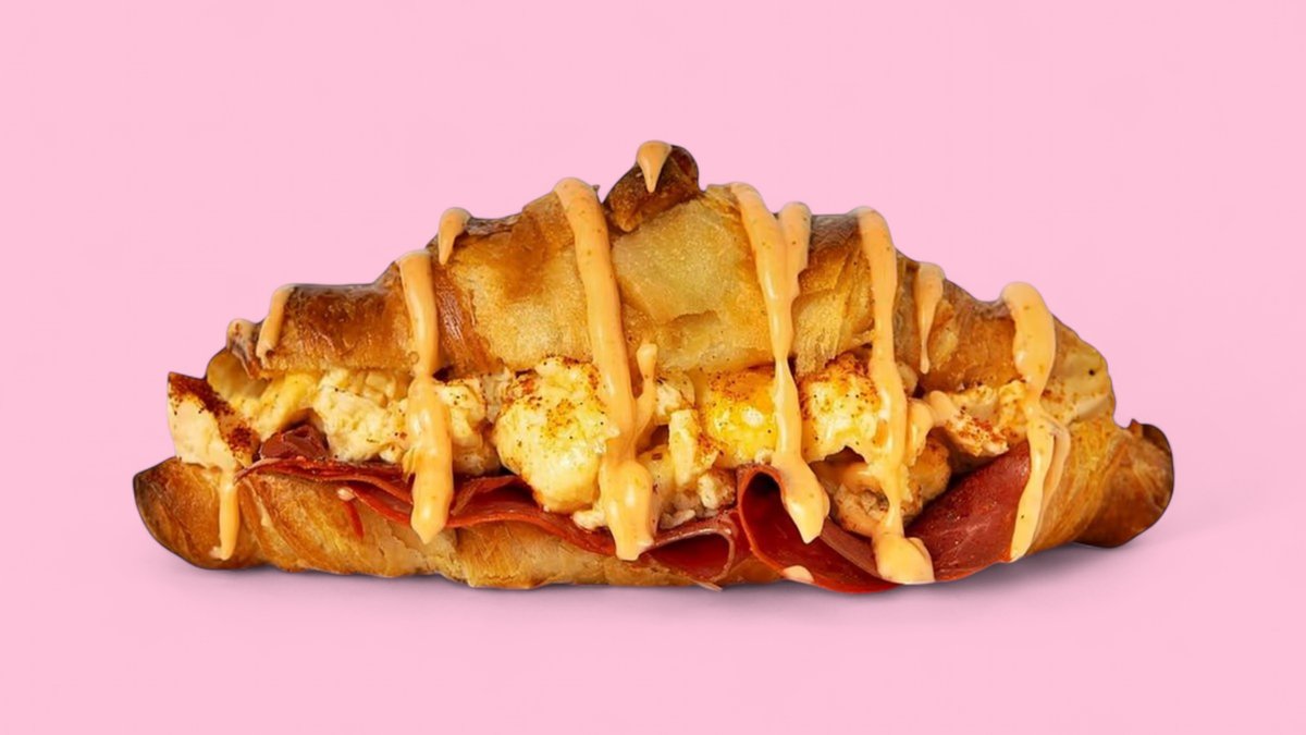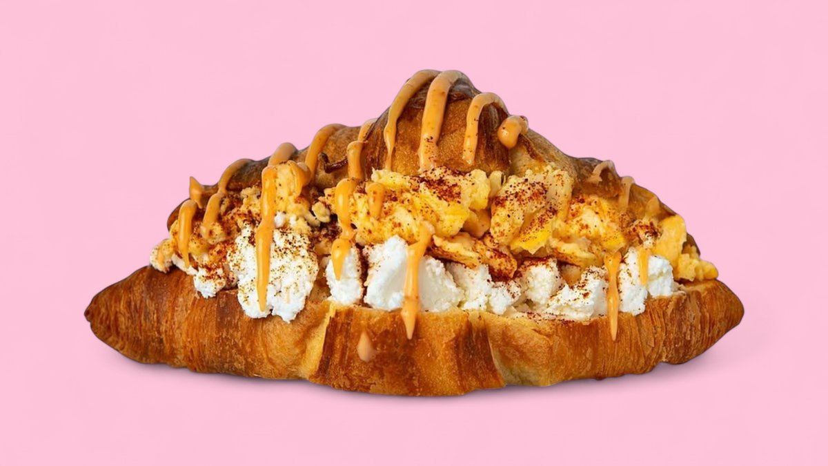 Ein frisches Croissant gefüllt mit Feta, Frischkäse, Rührei und Chilli-Mayo