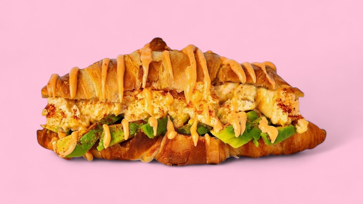 Ein frisches Croissant gefüllt mit Avocado, Frischkäse, Rührei und Chilli-Mayo