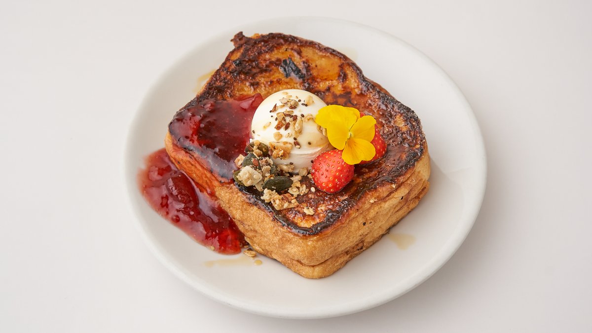 Brioche French Toast mit Erdbeer-Limetten-Marmelade, Granola, Gianduja-Creme, Ahornsirup, Crème fraîche und Beeren Das Gericht wurde mit Schokolade zubereitet und kann Spuren von verschiedenen Nüssen enthalten