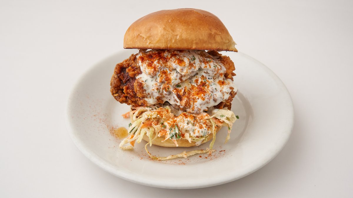 frittiertes Buttermilch-Hähnchen mit Brioche-Brötchen, hausgemachtem Krautsalat, scharfem Nashville-Honig, hausgemachten Gewürzgurken und hausgemachter Ranch-Soße