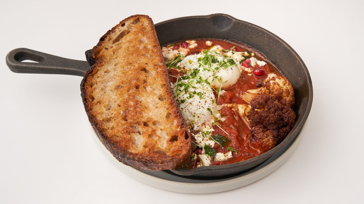 2 pochierte Eier mit nordafrikanischer Tomatensoße, Feta, Gremolata, geröstetem Blumenkohl und Sauerteigbrot