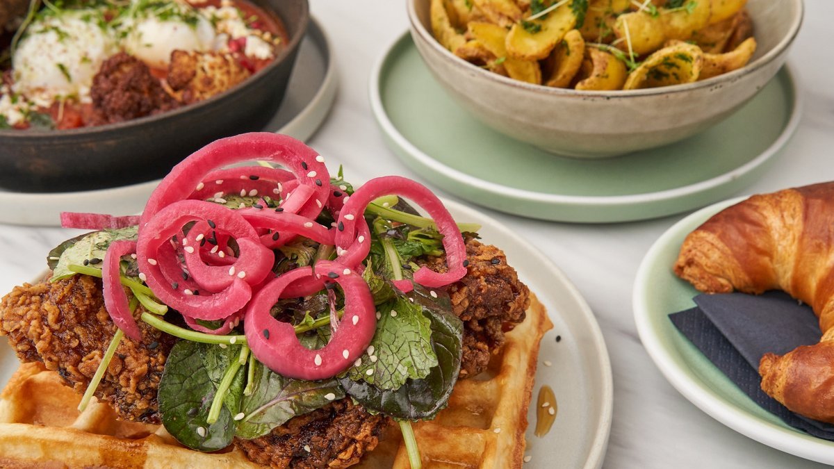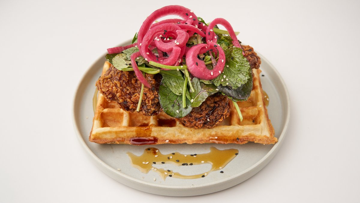 2 frittierte Buttermilch-Hähnchenstücke mit belgischer Waffel, Honigbutter, eingelegten Zwiebeln, süßer Soja-Knoblauchsoße und Ahornsirup