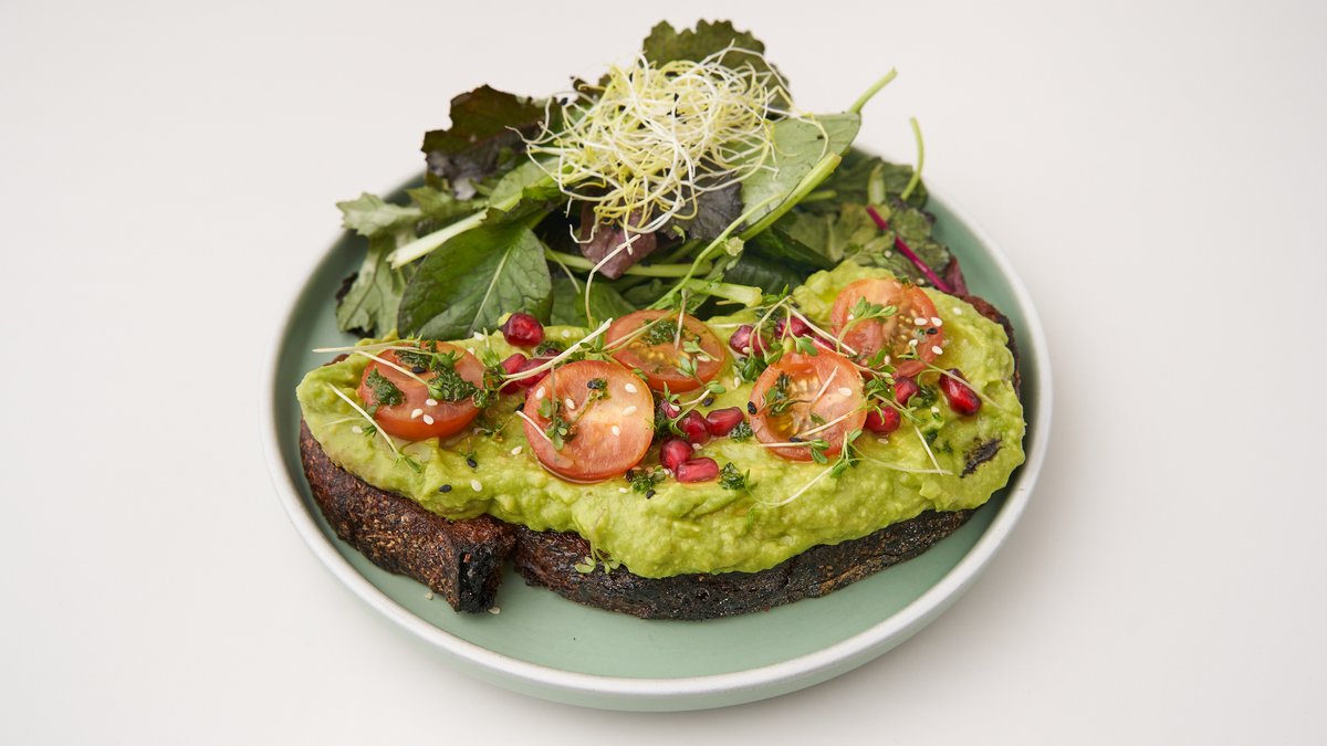 Smashed Avocado auf Sauerteigbrot von SOFI Wildkräuter Salat - Cherry Tomaten - Granatapfel - Kräuteröl