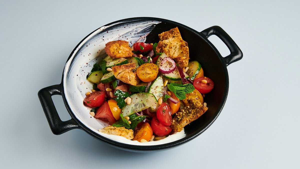 mit verschiedenen Tomaten, Gurken, Kalamata-Oliven, Minze, Sumach, Joghurt, Sonnenblumenkernen und Zaatar-Pita