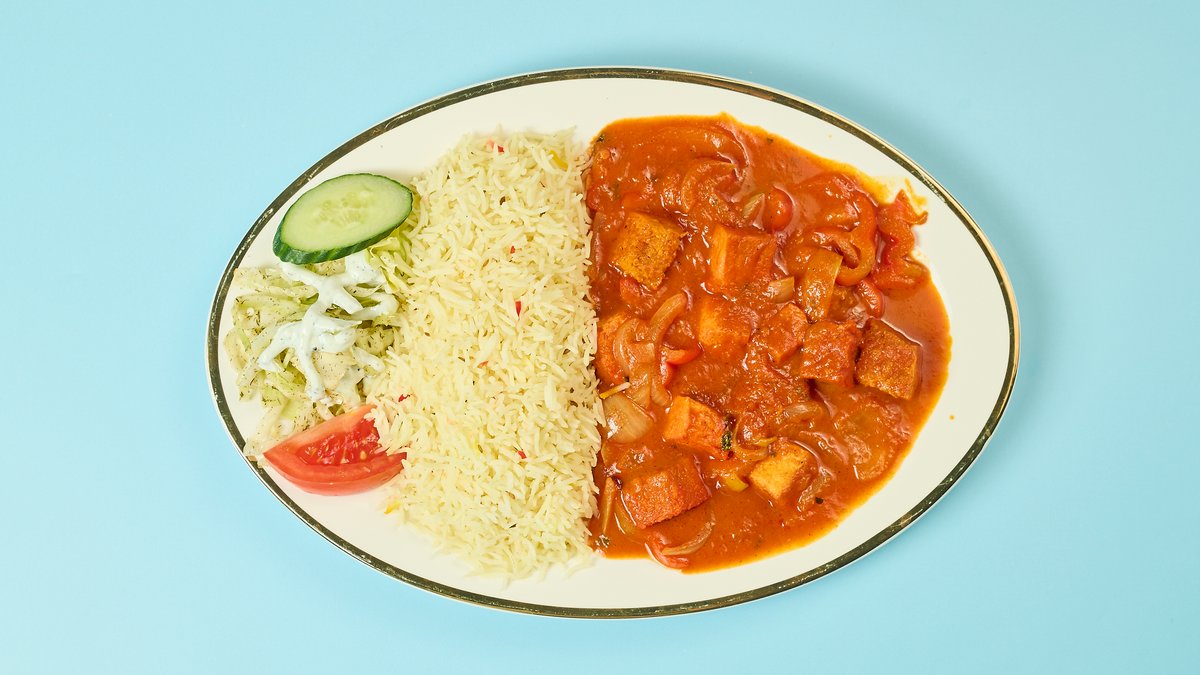 süß-scharf indischer Rahmkäse, gebraten mit Zwiebeln, Paprika, Tomaten, frischem Ingwer und Knoblauch in süß-scharfer Soße