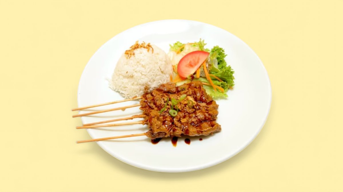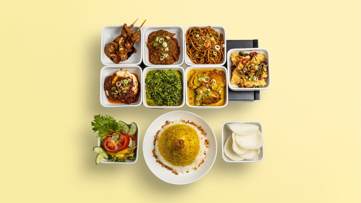 NASI KUNING (gelber Reis), serviert mit 1. SATE AYAM (Hühnerspieße), 2. RENDANG (Padang-Rindereintopf), 3. TEMPE OREK (karamellisiertes Tempe), 4. OSENG-OSENG SAYUR (Gemüsepfanne), 5. KERUPUK (Garnelencrackern)