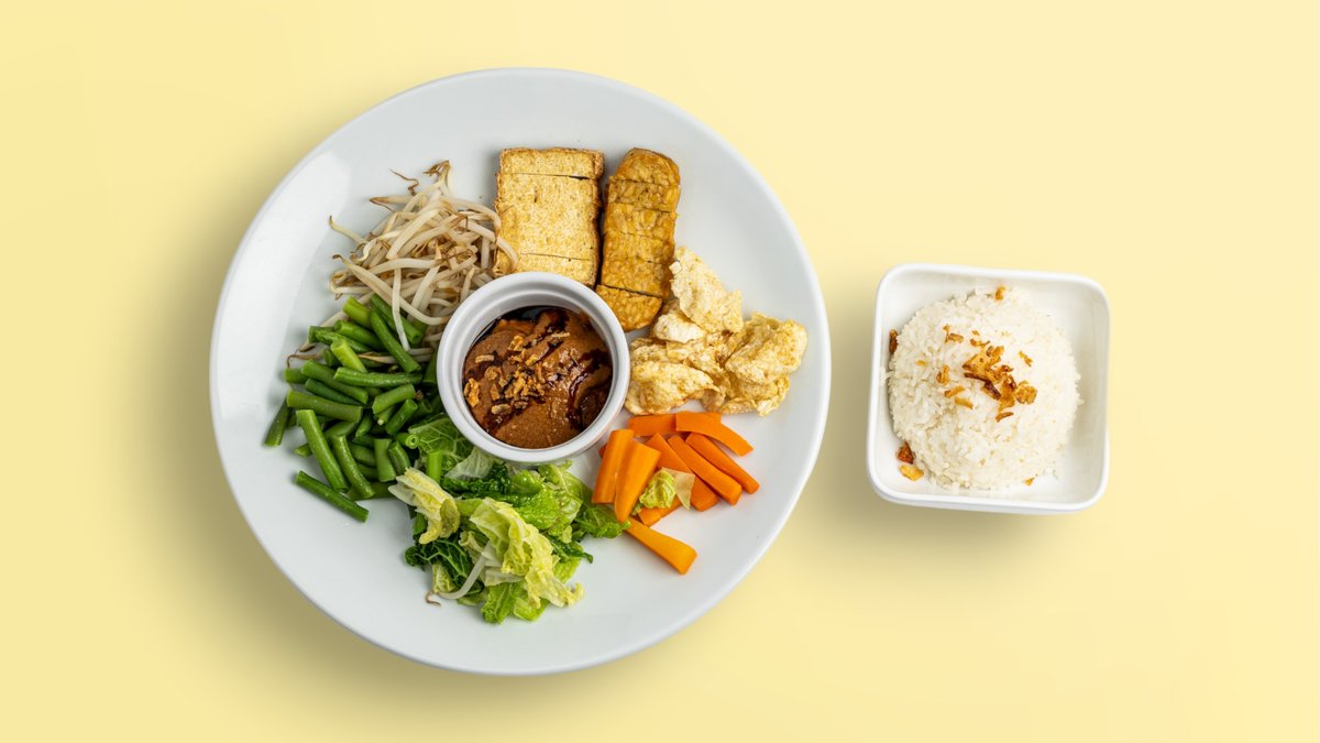 NASI PUTIH (weißer Reis), serviert mit 1. GULAI AYAM (indonesisches Hühnercurry), 2. TAHU&TEMPE GORENG (gebratener Tofu und Tempe), 3. TELOR MATA SAPI (Spiegelei), 4. OSENG-OSENG SAYUR (gebratenes Gemüse)