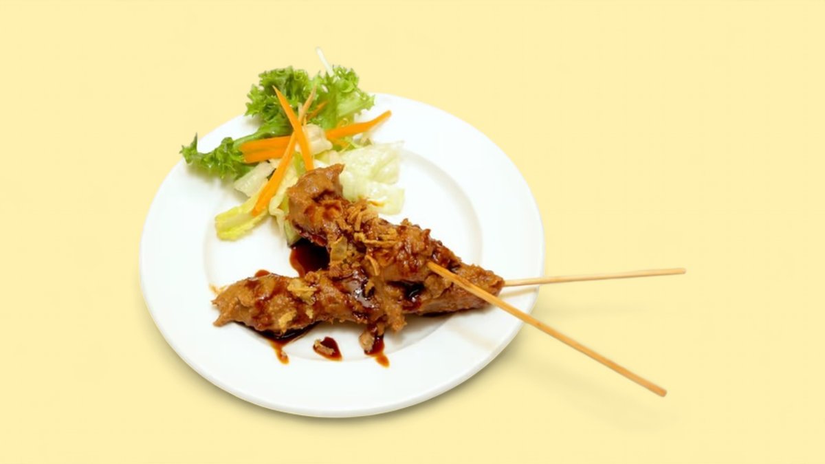 2 Stück in Koriander und süßer Sojasoße eingelegte Hähnchenspieße, serviert mit Erdnusssoße