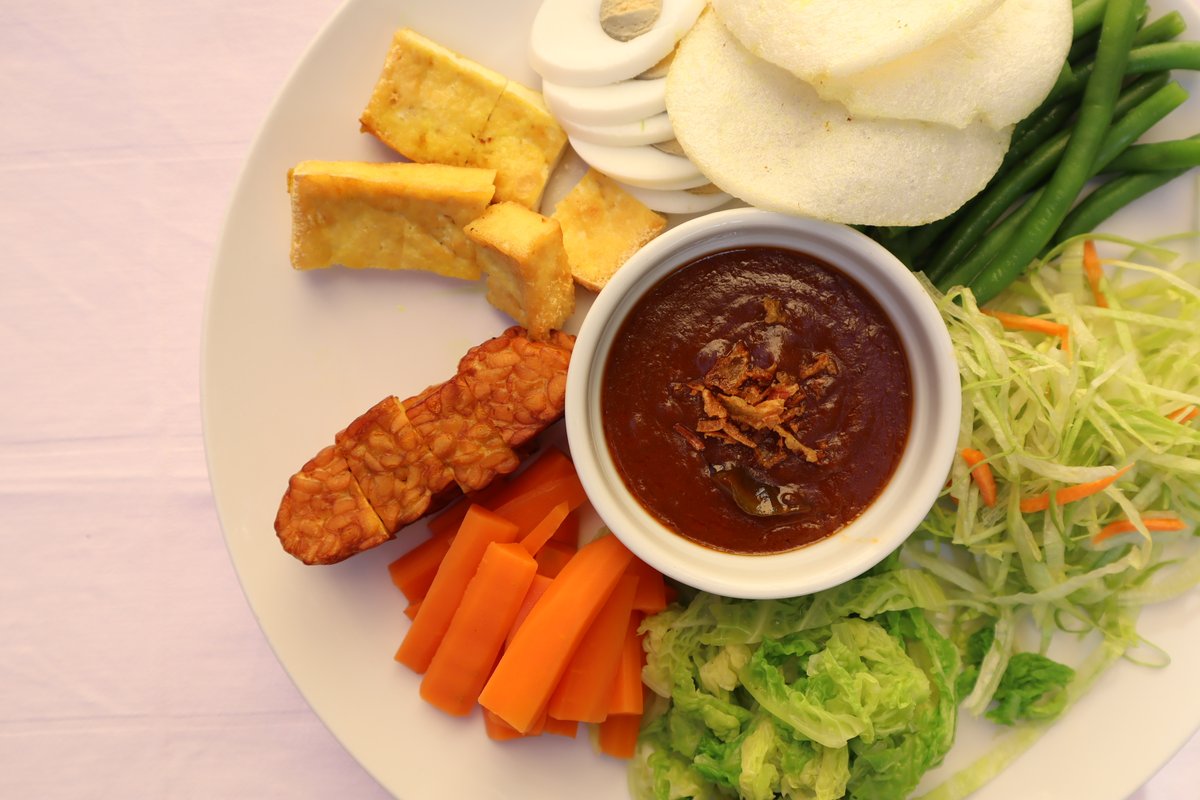 Gemischter Salat und Gemüse, serviert mit Erdnusssoße
