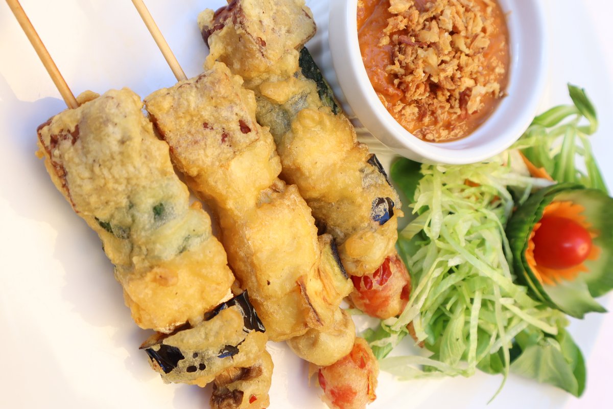 2 Stück Gemüsespieße aus Kirschtomaten, Champignons, Tofu und Tempeh, serviert mit Erdnusssoße
