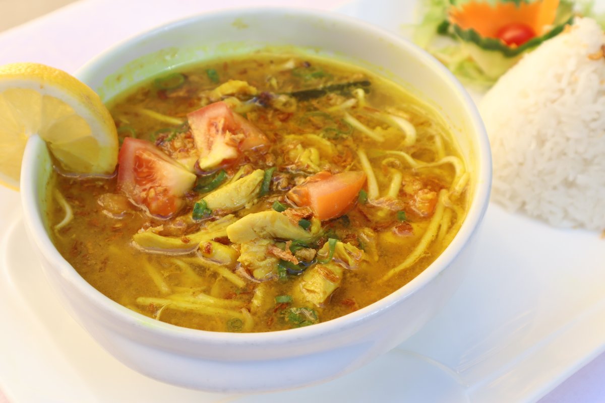 Traditionelle Hühnersuppe mit Glasnudeln, Sojasprossen, Tomaten und Frühlingszwiebeln in würziger Kräuterbrühe, serviert mit Reis und Emping (Gnetumsamen-Cracker)