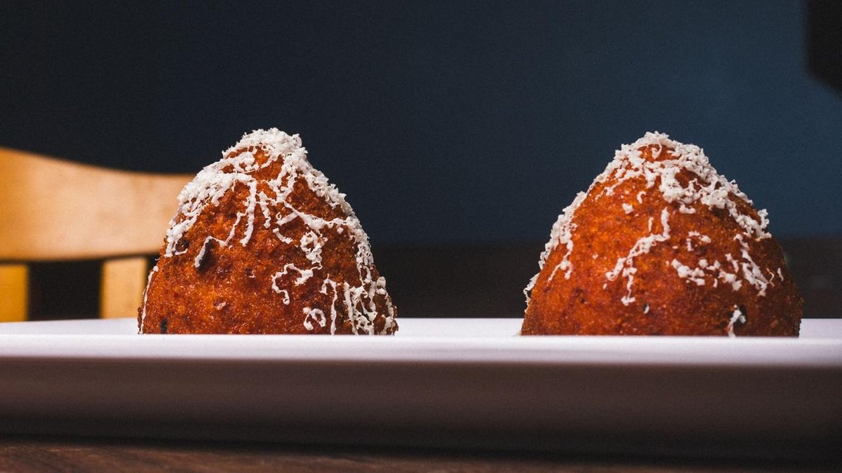2 Stück Reisbällchen mit Tomatensauce, Aubergine, Fior di Latte Provola-Käse, gesalzener Ricotta-Käse