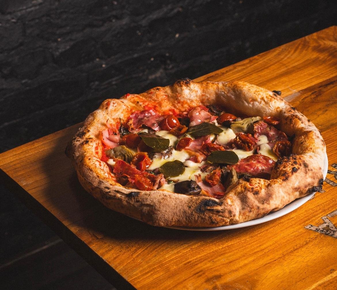 mit Datterini-Tomaten, Fior di Latte Mozzarella, Salami, Kochschinken, Kräutern, Mischpilzen, gegrillten Artischocken, Basilikum und Olivenöl Extra Vergine