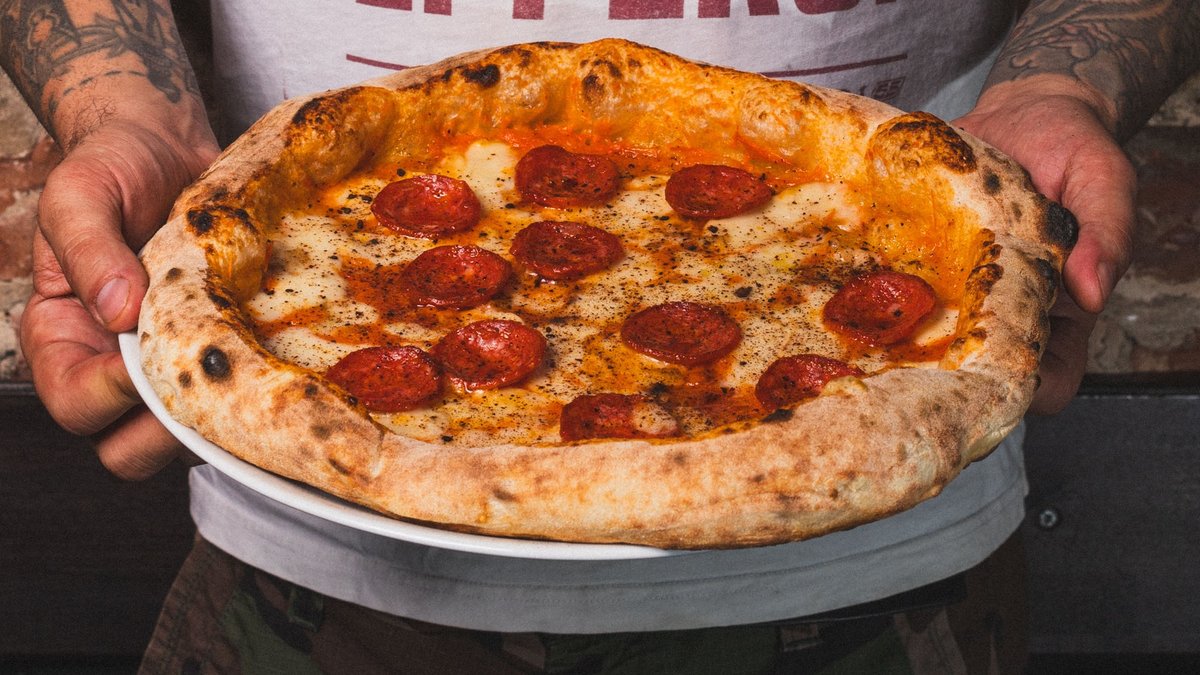 scharf mit Nduja aus Spilinga, Tomatencreme, Fior di Latte, Provola, scharfen Salami, Tartar aus schwarzen Oliven, Basilikum und Olivenöl Extra Vergine