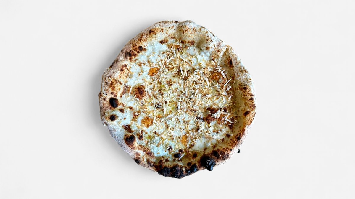 weiße Pizza (ohne Tomatensauce) mit Gorgonzolacreme, süßer Provolone, Fior di Latte Mozzarella, geräucherter gesalzener Ricotta und Quittenkompott