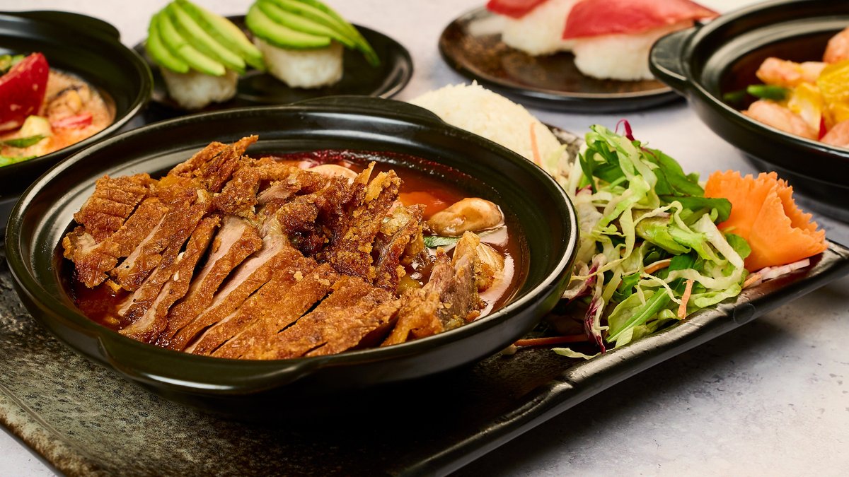 Ein lebendiges asiatisches Küchenangebot mit frischem Sushi, aromatischen Bowls, und Salaten