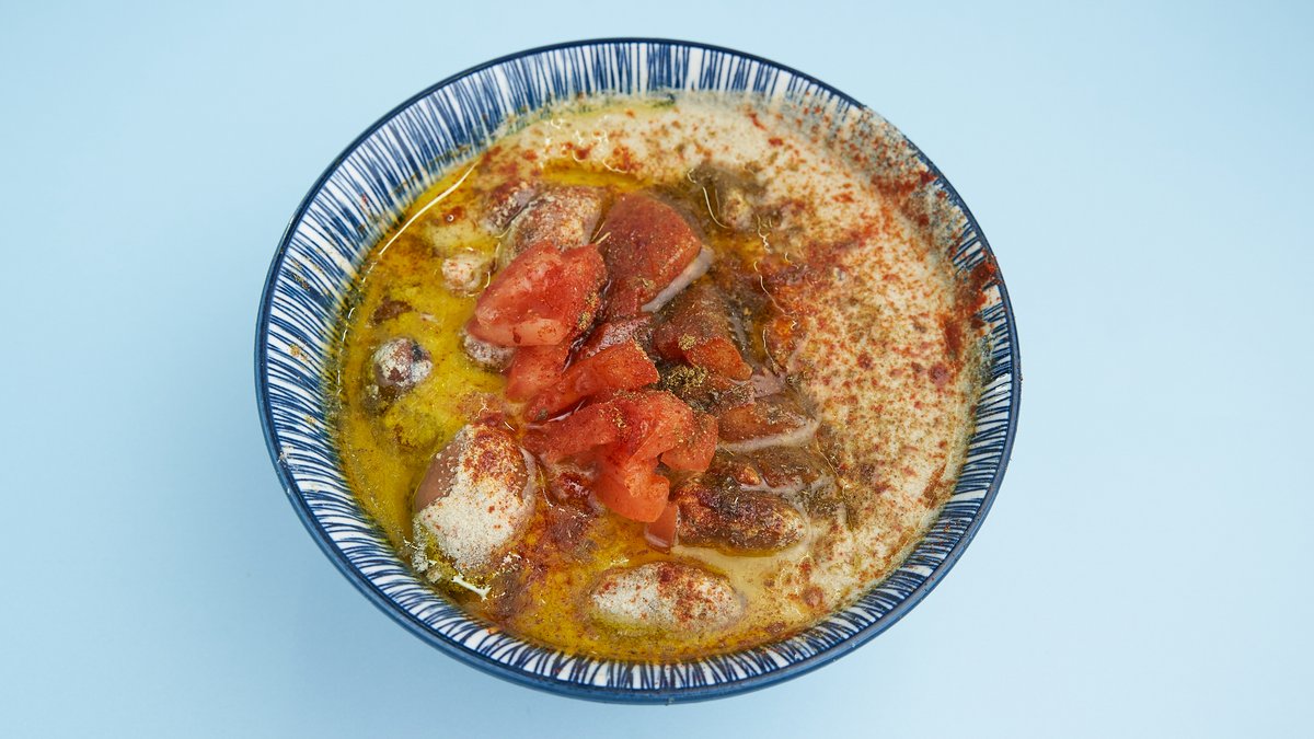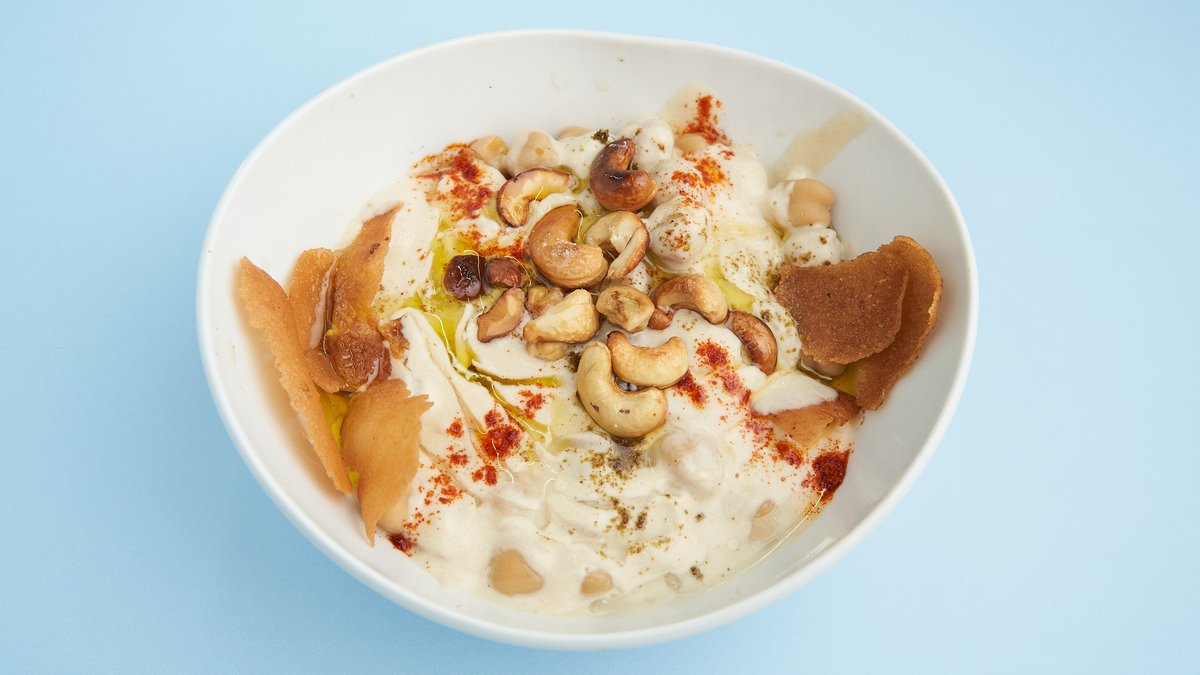 mit Kichererbsen, Joghurt, Brotchips und Knoblauch