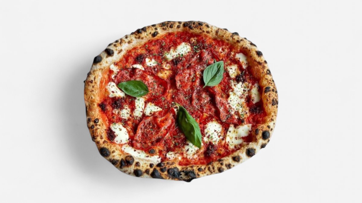 mit TomatensoĂźe, Mozzarella Fior di Latte, scharfem Spianata Salami vom Schwein, Nduja vom Schwein, Chiliflocken und getrocknete Petersilie
