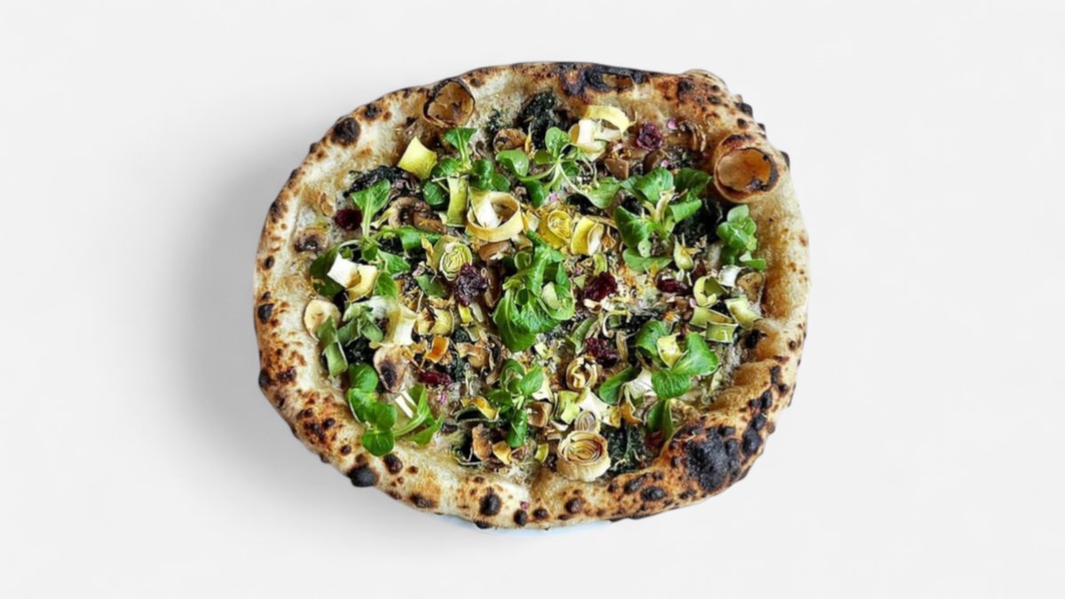 mit Oliven-Trüffel-Pate, Mozzarella Fior di Latte, Pilzen, Trüffelöl, getrocknete Petersilie und schwarzem Pfeffer