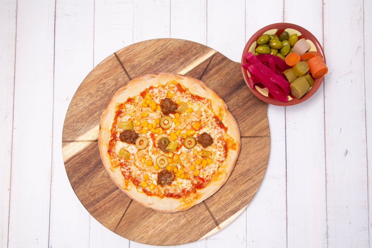 mit Rinderhackfleisch, Hähnchen, Gemüse, Peperoni, Oliven und Mais