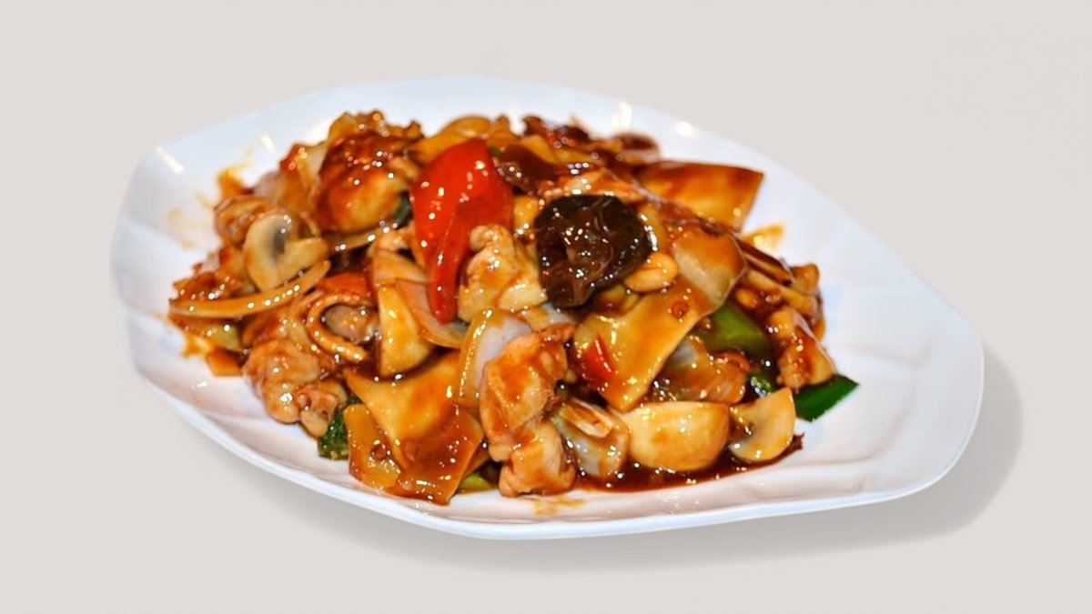 gebratene Hähnchenfleischstücke mit Gemüse, Chili, Erdnüssen und Knoblauch