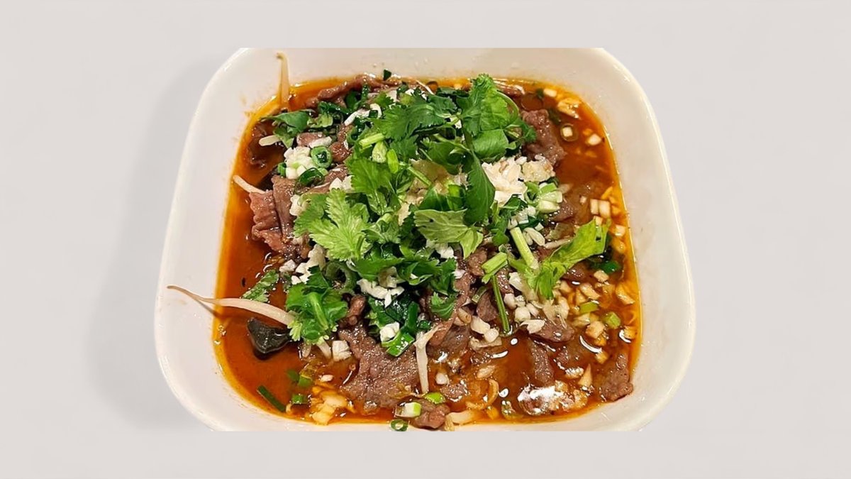 gekochtes Rindfleisch und Pansen in einer Soße aus Blütenpfeffer, Chili Öl und Korriander