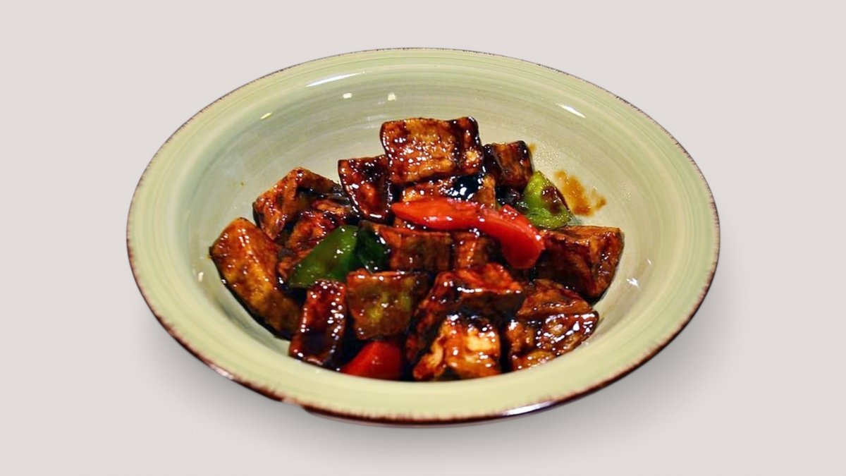 leicht scharf frittiertes Tofu mit Zwiebeln, Paprika, Koriander, Gewürzen, Salz und Blütenpfeffer