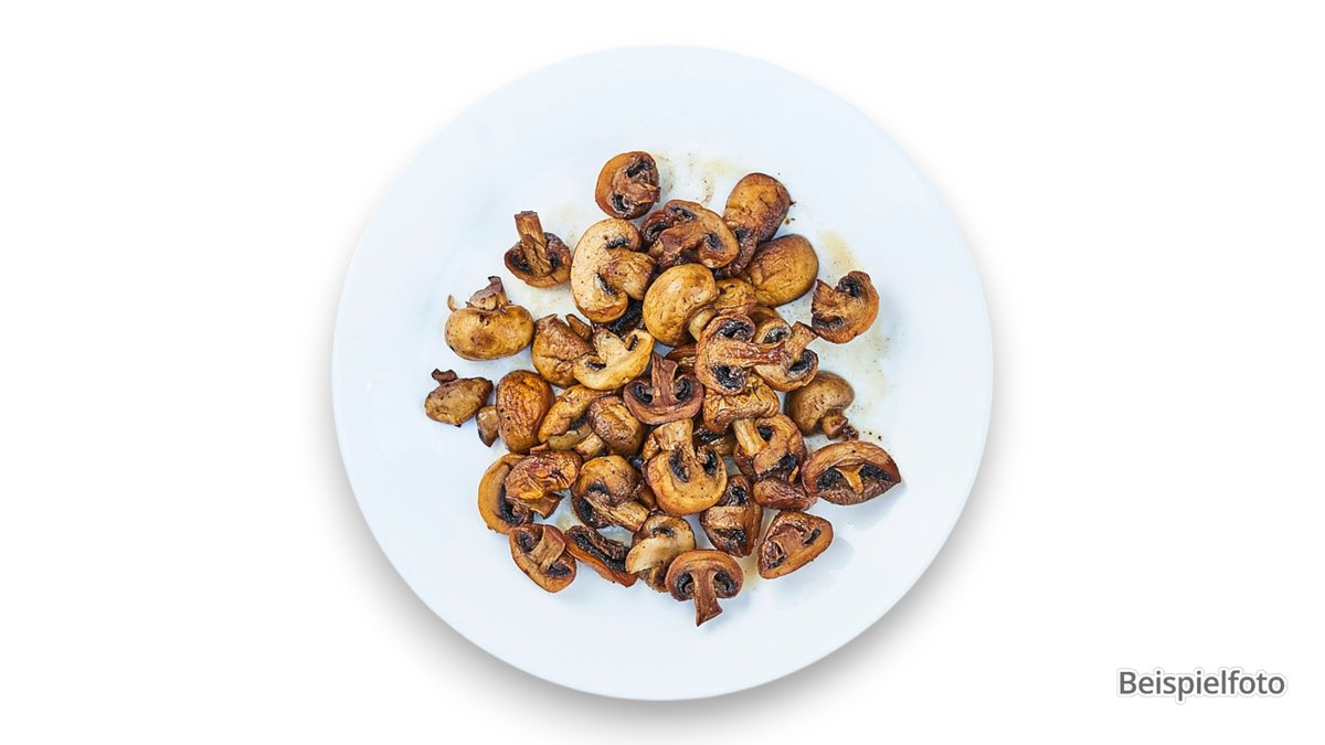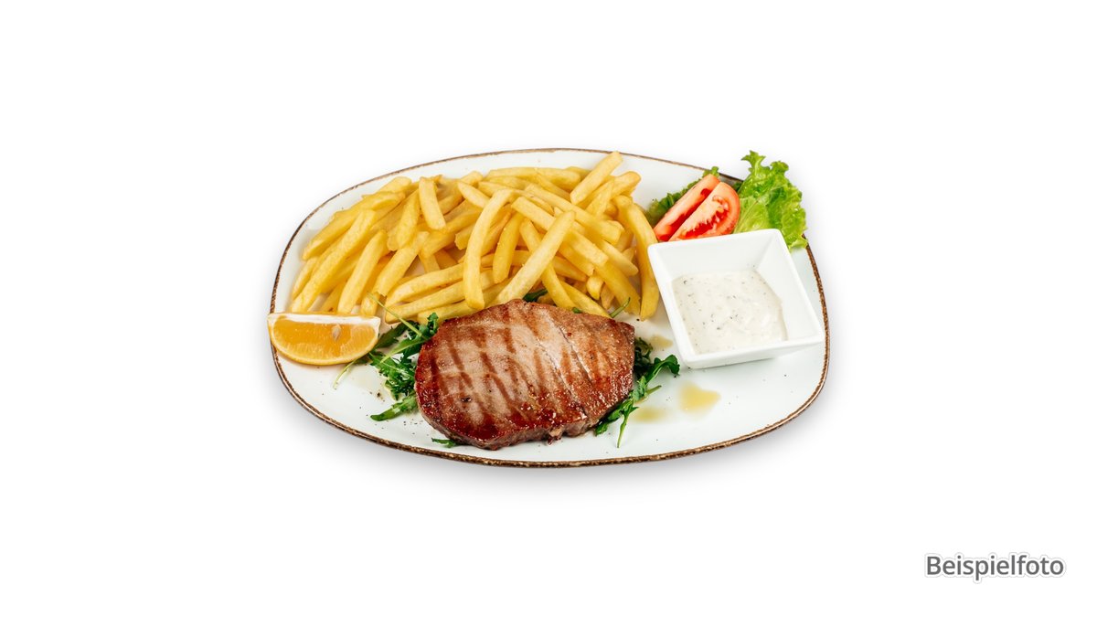 Schweinefleisch, Champignon-Rahmsoße und Steak Pommes frites