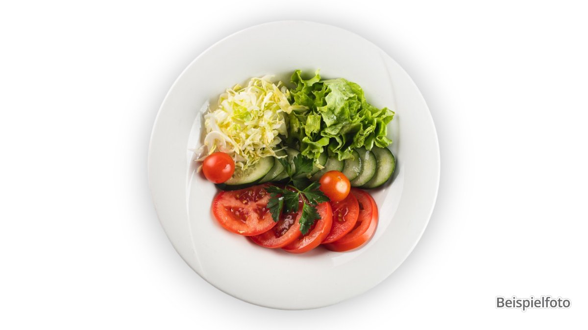 frischer knackiger Salat, Brot, Butter, Schinken vom Schwein, Spiegelei und Gewürzgurke