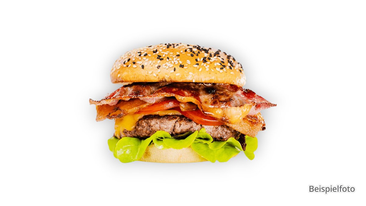 Black Angus Beef, Bacon vom Schwein, Gurke, Tomate, Zwiebeln, Salat, hausgemachte Cola-Soße, Steak Pommes frites und Knobidip