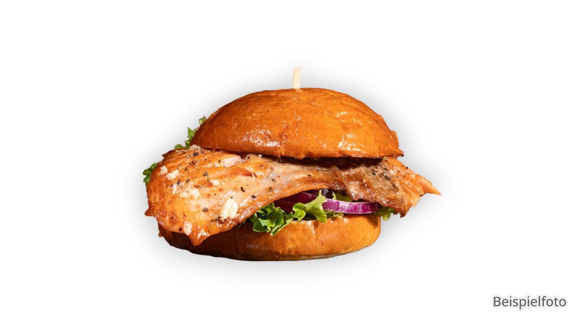 zartes Lachsfilet gebraten, Gurke, Tomate, Zwiebeln, Salat, Cola-Soße, Steak Pommes frites und Knobidip