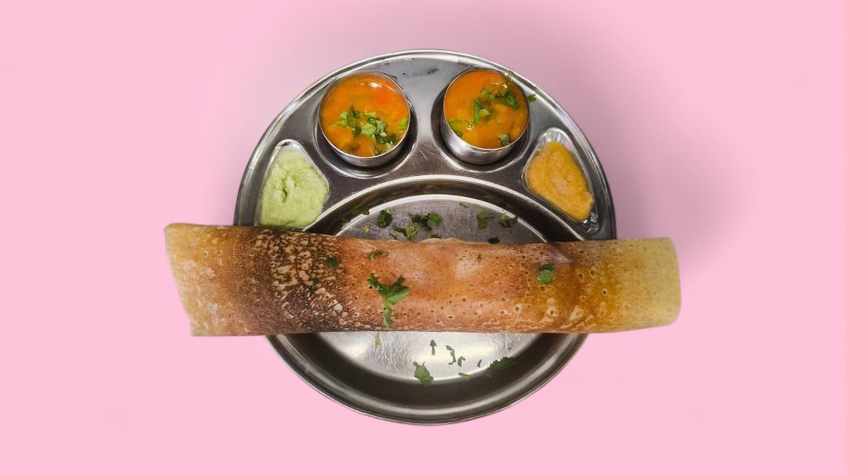Knuspriger Crépe aus Reis,Linsen, Kartoffeln,Backshornklee & Curryblättern, mit Chutney & Sambar serviet